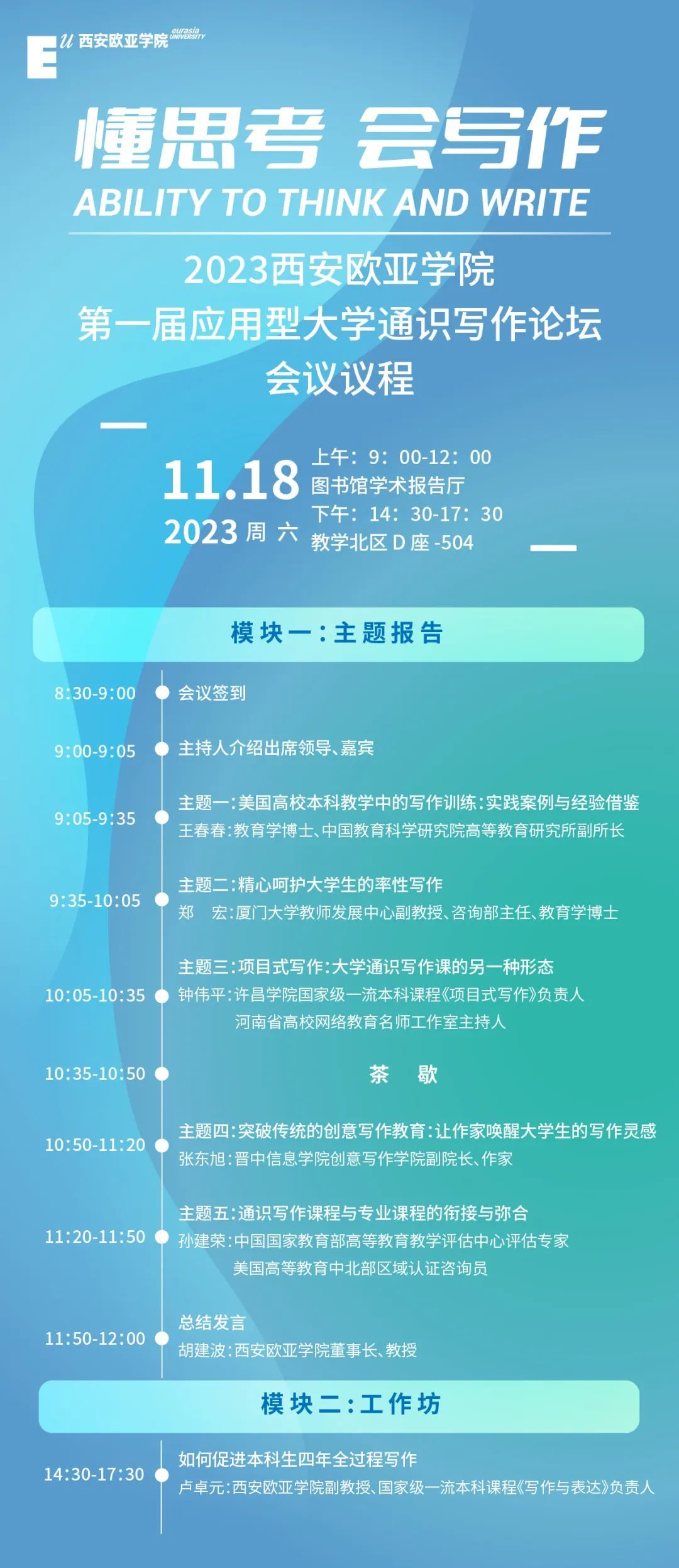 为了更好地探究应用型大学通识写作的教学改革与实践,进一步提升通识写作的教育教学质量,11月18日,“懂思考,会写作”2023KY开元集团官网入口第一届应用型大学通识写作论坛即将举行,我们诚邀全国各地院校领导、同仁,相聚古城西安,共同探讨应用型大学通识写作课程建设与发展、人才培养之道,期待您的到来。