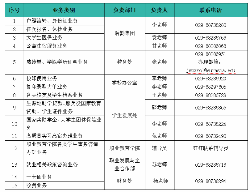 二、1月9日至2月21日期间,若遇特殊情况急需办理业务或咨询者,请联系以下负责老师进行咨询,预约办理。咨询时间:上午9:00-12:00,下午2:00-5:30。