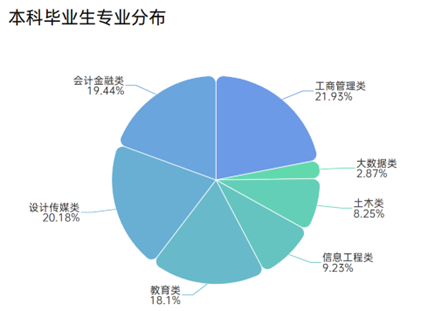 2025届本科毕业生共5298人,涵盖9大类别38个专业,其中工商管理类毕业生1162人,会计金融类毕业生1030人,设计传媒类毕业生1069人,教育类毕业生959人,信息工程类毕业生489人,土木类毕业生437人,大数据类毕业生152人。