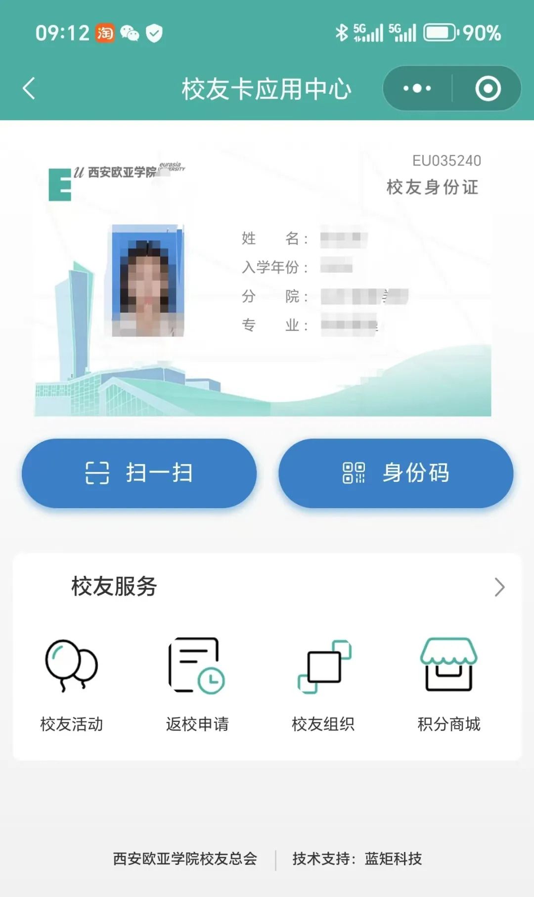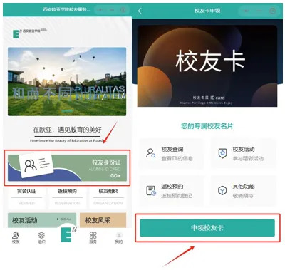 7.认证审核通过后,点击校友服务小程序首页【校友身份证】,进入校友卡申领。