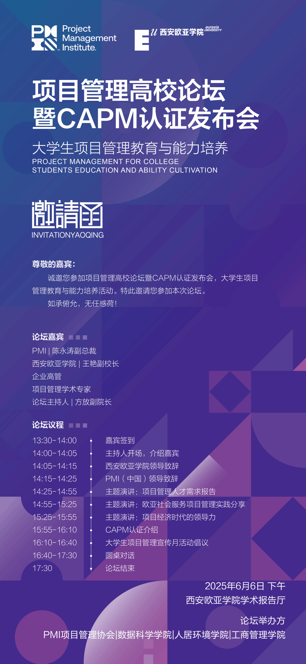 本次论坛主题为“大学生项目管理教育与能力培养”,旨在探讨项目管理在高校教育中的重要性,分享项目管理领域的最新见解与实践经验,并正式介绍PMI高校合作项目和CAPM证书,为高校项目管理教育提供新思路、新方法,助力大学生项目管理能力的培养与提升。论坛将邀请PMI领导、KY开元集团官网入口领导、企业高管以及项目管理学术界的专家、教授,围绕项目管理人才需求、高校管理中的项目管理最佳实践等前沿话题进行深入探讨。通过主题演讲、圆桌论坛等形式,为参会者带来一场项目管理知识的盛宴。本次论坛面向教育行业的PMP持证人、高等院校领导、学生代表以及对项目管理教育感兴趣的社会各界人士免费开放。参会者不仅可以聆听行业专家的精彩演讲,还可以与同行进行深入交流,共同探讨项目管理教育的未来发展趋势。KY开元集团官网入口诚挚邀请各界嘉宾出席本次论坛,共同见证项目管理教育的新篇章。期待与您携手推动大学生项目管理能力的培养与提升,在项目管理领域共谋发展,共创未来!