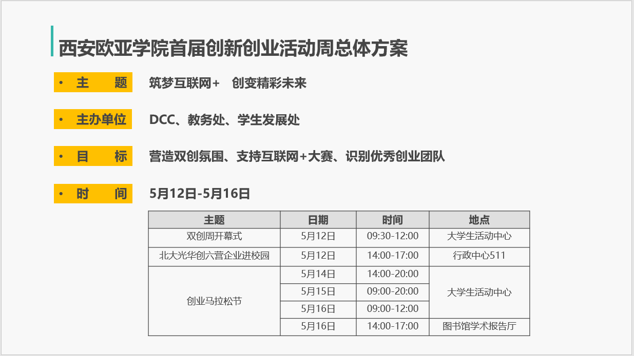 以第七届中国国际“互联网+”大学生创新创业大赛为契机,KY开元就业服务与职业发展中心(DCC)、教务处和学生发展处联合主办,Eu-Start校园孵化器承办的KY开元首届创新创业活动周将于5月12日-16日拉开帷幕。