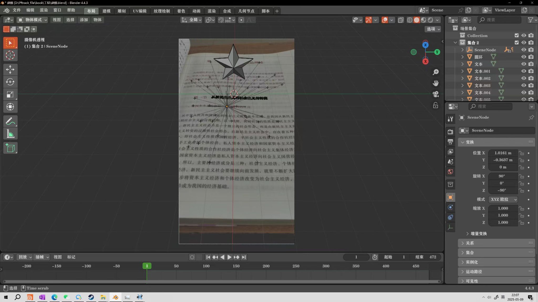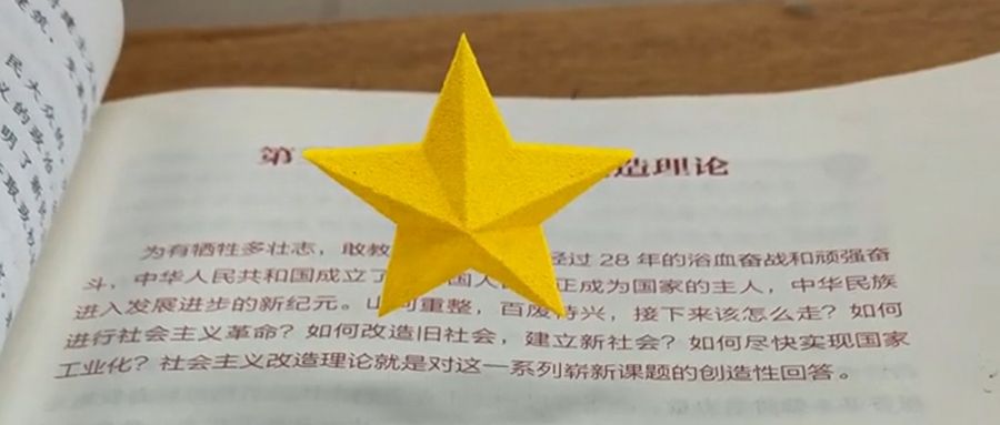 为了保证核心想法的演绎最佳效果,从脚本到技术,王光宇在前期尝试了很多可能。最终他选定4款软件,在两天的时间内,集中完成了这部名为《人民万岁》的视频创作:”为了还原当时的情景,我回到教室用手机拍摄了书本视频,之后将视频导入AE,追踪并抠除文字,再用内容识别重新填充。AE处理好的视频随后导入PFtrack中进行摄像机反求,得到反求结果后导入Blender,在软件中建模与视频一样的场景,并创建与教室灯光系统相同的阴影反射,以保证视觉上的真实感。接下来制作将书上的字演变为五角星和党徽的特效模型,再导入Houdini,用粒子填充模型与动效。最后再做一些材质的选择,完成整个视频的渲染与发布。”
