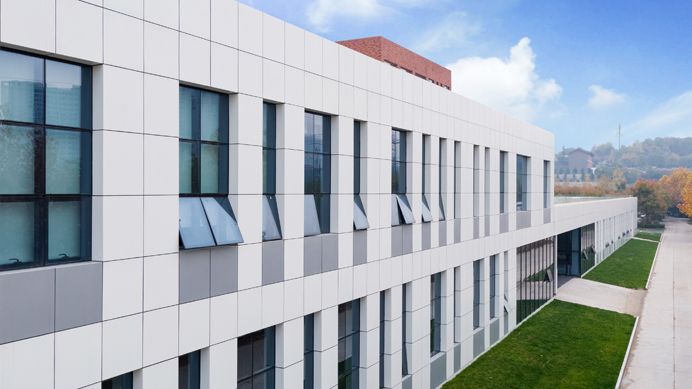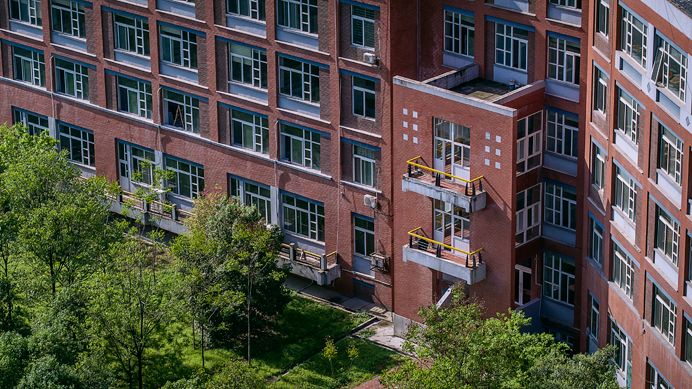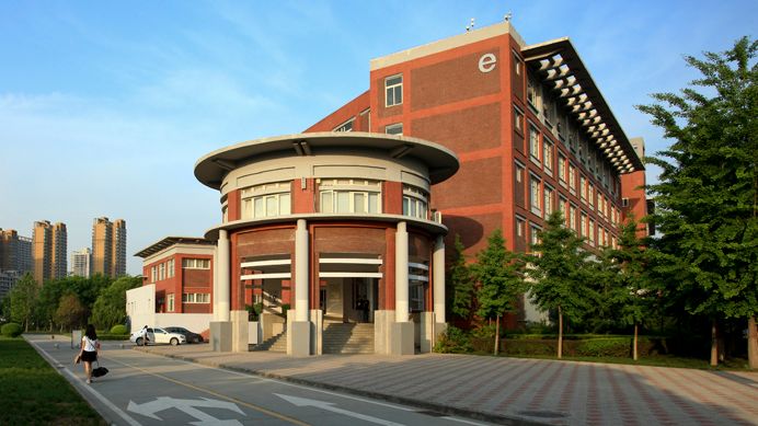 南区教学楼位于行政中心西侧,与北侧的联体教学楼共同围合起欧亚的核心公共空间。其外立面用红色面砖与白色涂料,辅以灰色面砖和玻璃材质,形成具有立体构成意味的建筑风格。在空间上,采用了模数化的开窗设计,在红、白、灰体块的开窗方式各具变化的同时,又使各部分统一为一个有机的整体。楼宇整体呈回字形,采用首尾相连的合院式布局组织起艾德艺术设计学院、文化传媒学院、数据科学学院和会计金融学院四大分院的教学楼群。