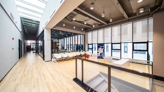 设计与媒体实验中心室内空间布置的功能主要包括工作室和展示使用。其工作室有艾德艺术设计学院的建模工作室、数字输出中心、跨领域联合办公室、新材料及创新设计教育中心、沉浸式交互实验室、数字影像工作室;文化传媒学院的互动与文化创意中心、网络新媒体中心、无人机影像工作室、创意传播工作室。展示空间分别有两个小厅以及一个以大台阶为主体的复合型演示空间。作为欧亚全新的资源整合中心,设计与媒体实验中心以开放性空间和校企合作的包容性态度,...