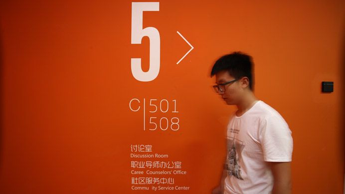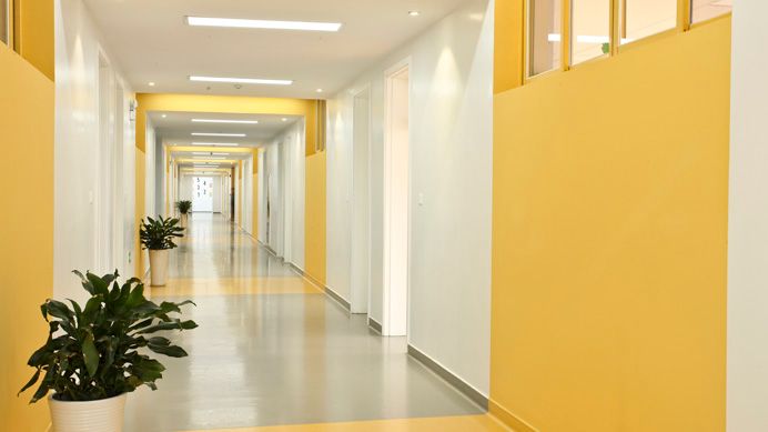 教学楼建筑群的四个分院拥有各自独立的入口及接待处,并采用不同的标识和墙体颜色作区分。结合每个分院独特的理念和精神,设计师stéphane ROUX赋予了建筑不同的主题。艾德艺术设计学院是接近大地的赭色,纯朴又不乏创造感;数据科学科学院是活泼的黄色;会计金融学院是沉稳的蓝色;文化传媒学院则是跃动的水蓝色,这种差异使得整体的室外环境显得更加丰富。看似是完全不同的四个小世界,却由回廊相通并连接,实现了分院间的资源共享和联合,包括课程之间的学术交流、与不同背景的学生彼此观念上的吸收等,激发创造力。