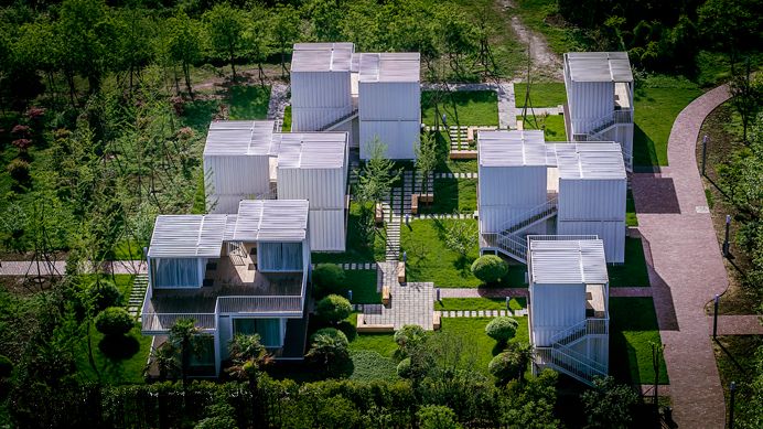 琴岛以6组可移动的集装箱作为主体,共58间房。外立面由玻璃打造,阳光投射进来,人和建筑都温暖而明亮,同周围环境和谐与共。