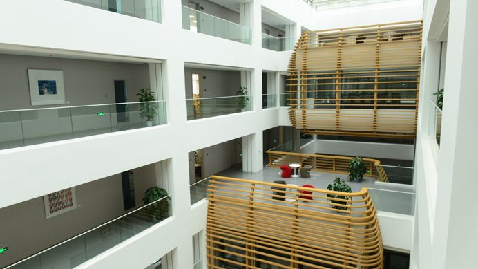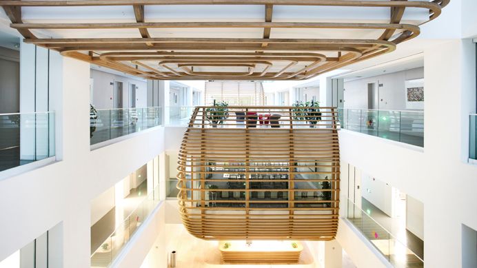位于楼体中心的特殊装置“鸟巢”,是作为互通空间里的会议区域,全透明的玻璃架构外层同等距地包裹着木条,既不影响光线的穿透感,又保留了一丝视线的隐秘感。考虑到光的因素,行政中心楼层的颜色透明度各异,由下自上逐层加大。渐变色的回廊墙体,围绕并包裹着位于不同楼层、不同位置的3个鸟巢,好似太空中的球体,让置身其中的人仿若漂浮一般,慢慢遗忘外界而进入一个新的境界。